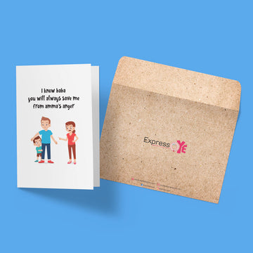 I know baba you will always save me from amma's anger--This Parents Day card is for your baba; get him one to let him know how you always look up to him when your amma is angry.